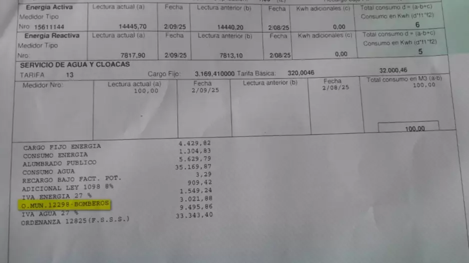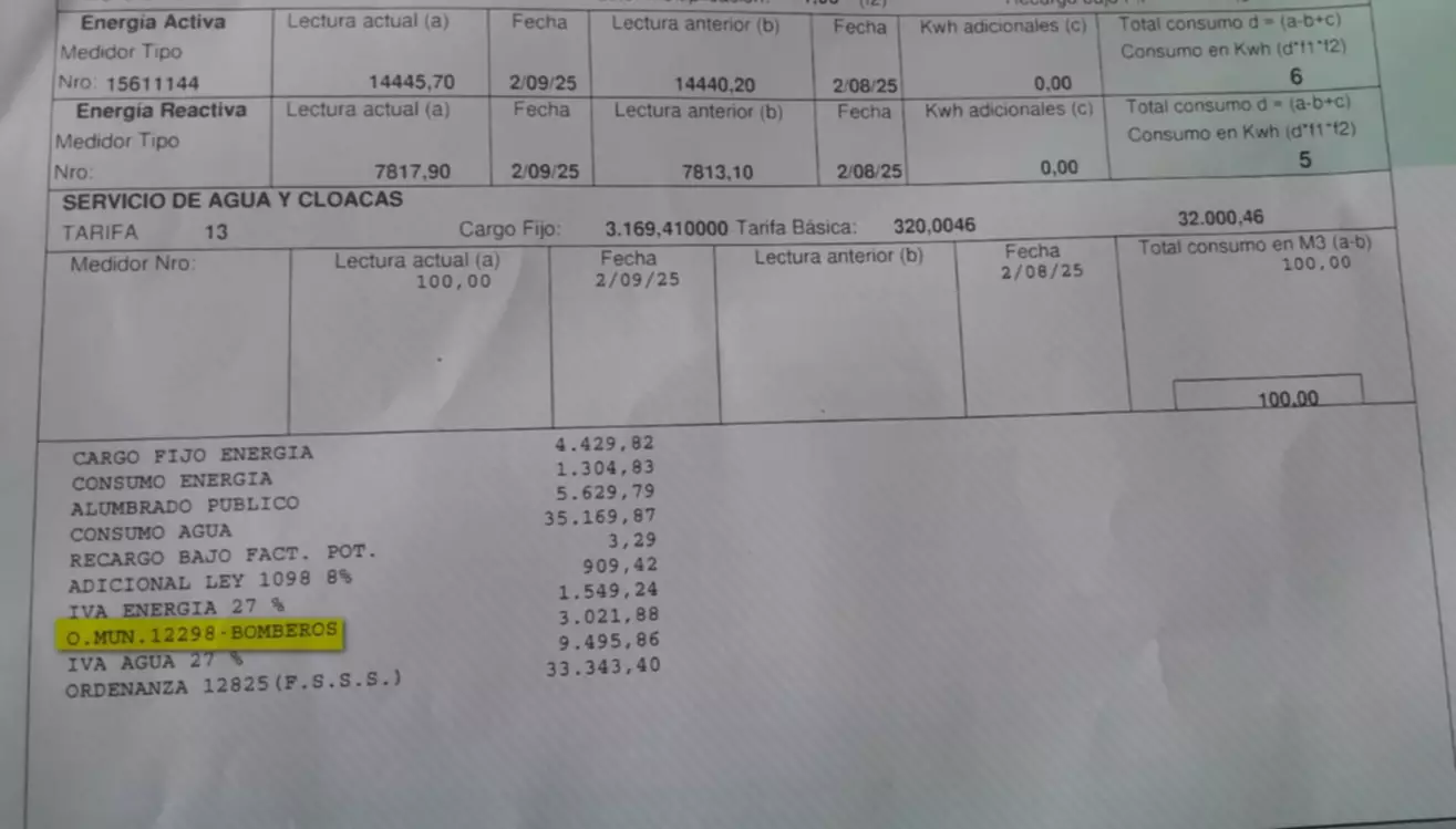 Culminando septiembre, un hecho generó controversia: las boletas que ya fueron impresas con los consumos detallados y enviadas a los usuarios siguen incluyendo el cobro de la Ordenanza Municipal 12.298 Bomberos.