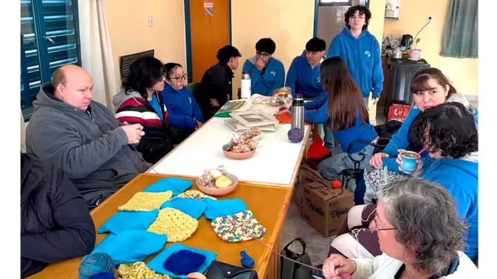 Estudiantes de quinto año del Colegio Camwy de Gaiman, junto a integrantes del servicio de operadores de Salud Mental, participaron de un encuentro de tejido, como parte de las actividades del proyecto solidario «Afrazados» que impulsan en el establecimiento educativo.