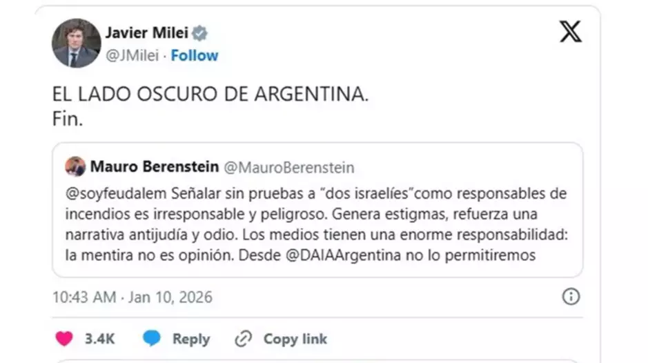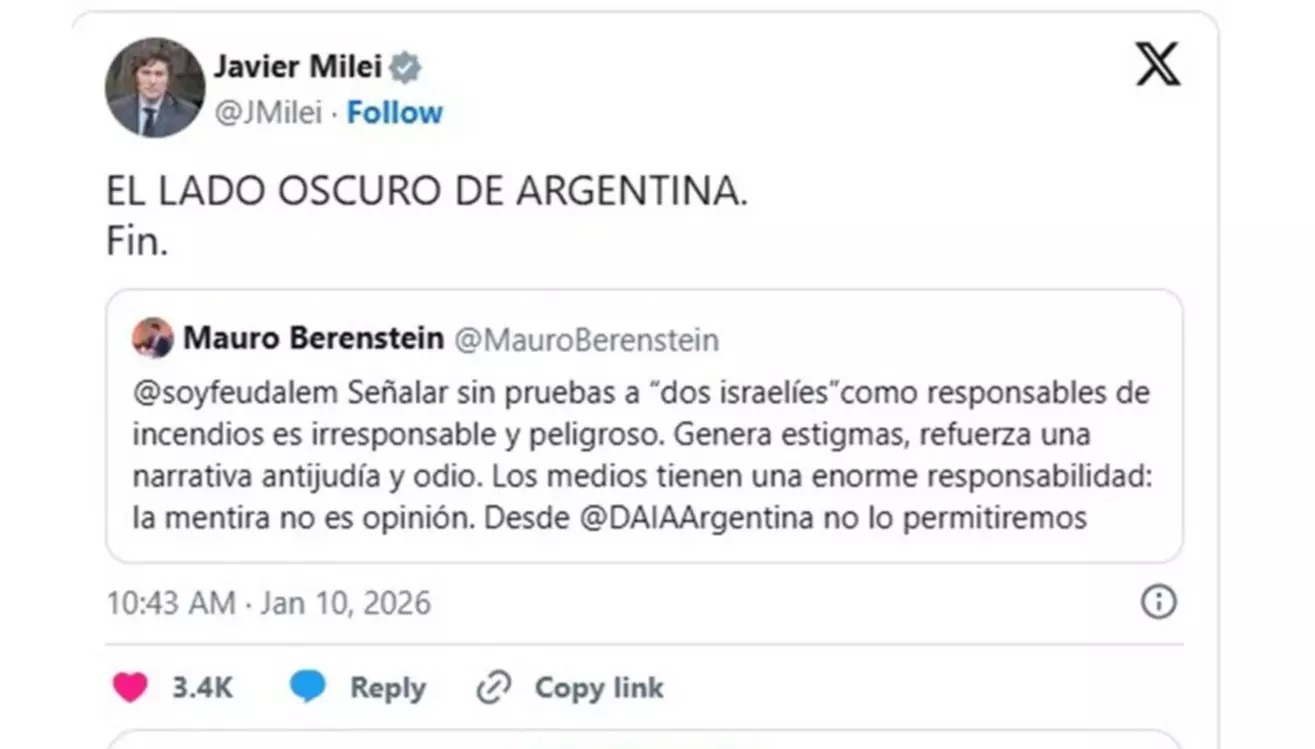 La cita que compartió Milei corresponde a un mensaje del presidente de la Delegación de Asociaciones Israelitas Argentinas (DAIA), Mauro Berenstein, quien había advertido contra la difusión de versiones que atribuían sin pruebas a dos ciudadanos israelíes como causantes de los fuegos. Berenstein señaló que acusaciones de ese tipo son irresponsables, peligrosas y generan estigmas, además de reforzar narrativas antijudías y de odio, algo que desaconsejó expresamente.