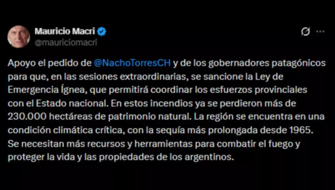 El presidente del PRO, Mauricio Macri, expresó en redes su “apoyo el pedido de Ignacio Torres y de los gobernadores patagónicos para que, en las sesiones extraordinarias, se sancione la Ley de Emergencia Ígnea, que permitirá coordinar los esfuerzos provinciales con el Estado nacional”.