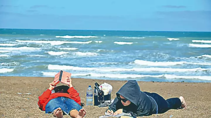 En otra postal, el disfrute tomó un ritmo más tranquilo: dos jóvenes aprovecharon el entorno para leer y escribir sobre la arena, recostados frente al mar, evidenciando que Playa Unión no solo convoca a quienes buscan actividades recreativas, sino también a quienes eligen un espacio de calma y conexión con la naturaleza.