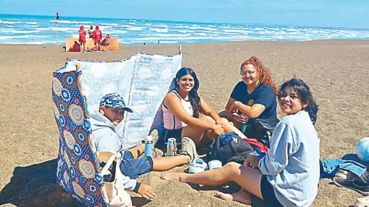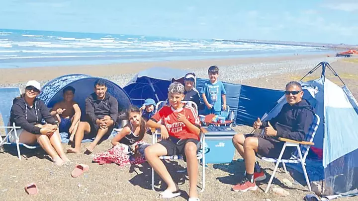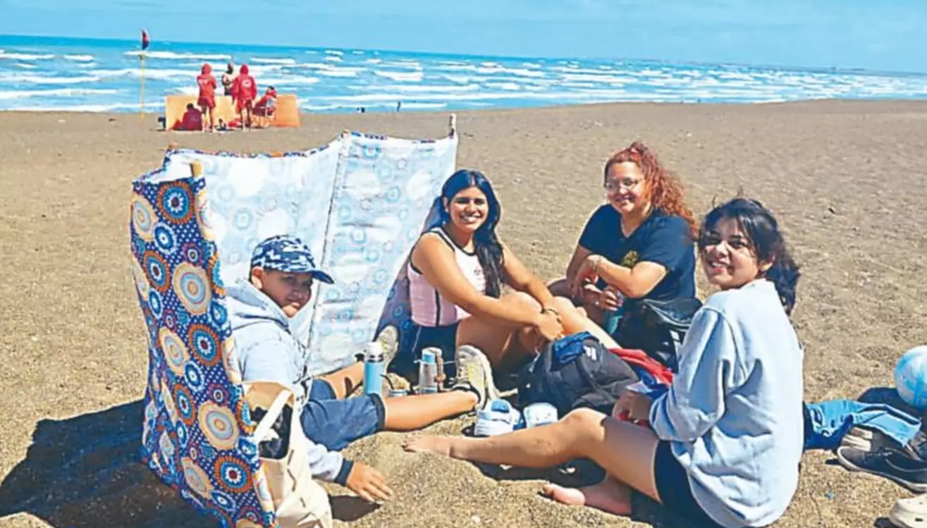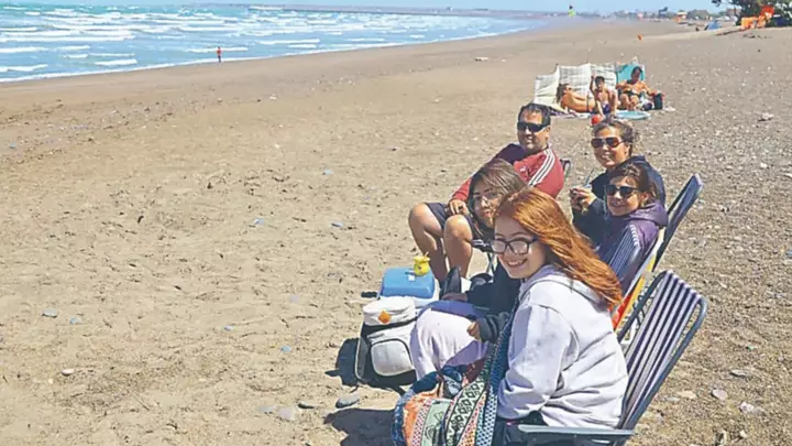 Desde temprano, se pudo observar a numerosos visitantes instalados sobre la arena con reposeras, conservadoras y carpas rompevientos, una postal clásica del balneario. En una de las imágenes se aprecia a un grupo familiar numeroso compartiendo la tarde frente al mar, resguardados del viento y disfrutando del aire libre, en un clima distendido y de descanso. Niños y adultos permanecieron largas horas en la playa, algunos jugando, otros conversando o simplemente contemplando el paisaje costero.