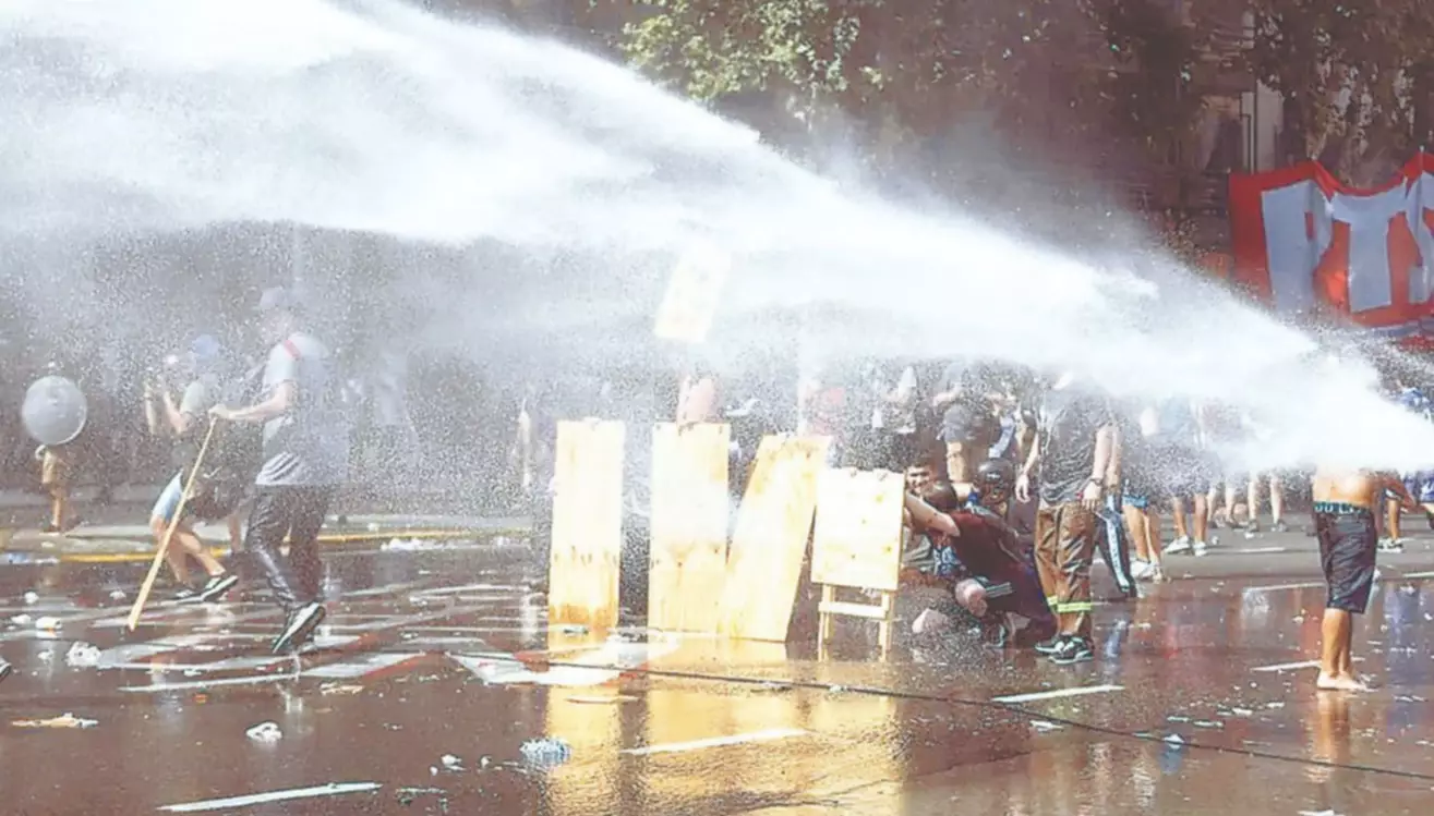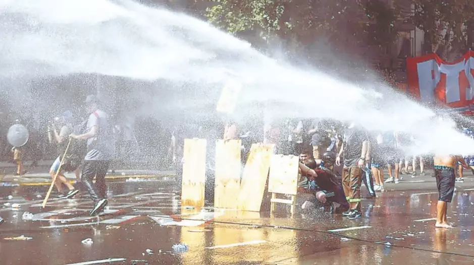 Guarecidos con bloques de madera, los manifestantes armaron bombas Molotov y enfrentaron a la Policía, que respondió con el camión hidrante y balas de goma.