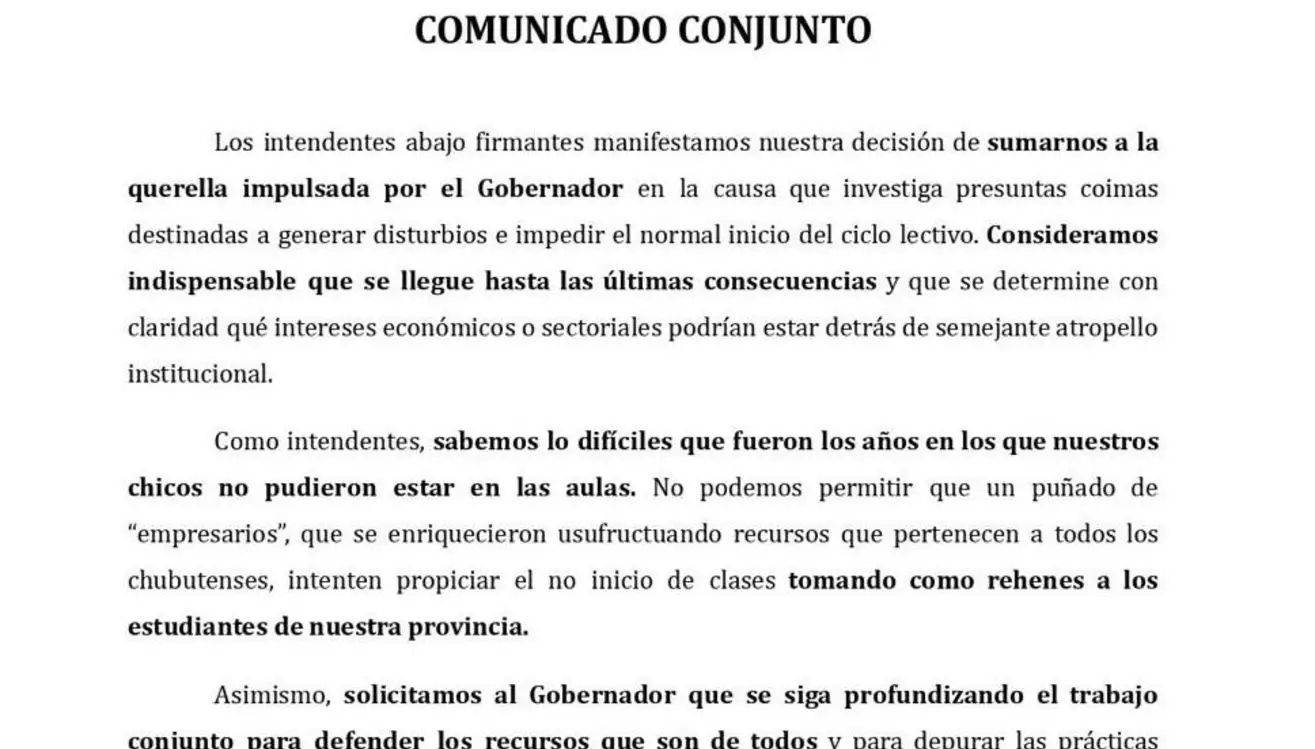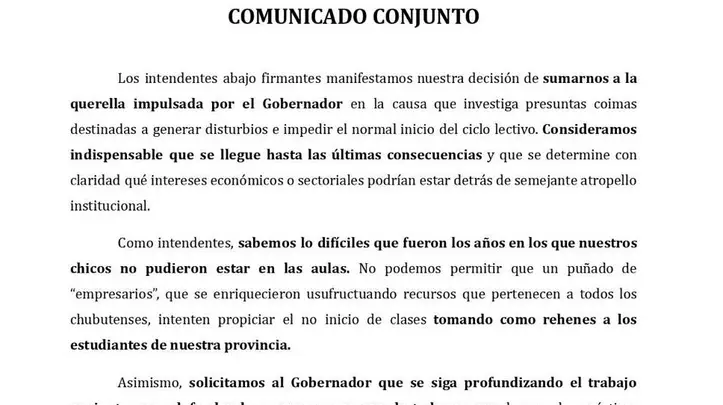 El Gobierno del Chubut informó que intendentes de distintas localidades de la provincia manifestaron formalmente su decisión de sumarse a la querella impulsada por el gobernador Ignacio «Nacho» Torres en la causa que investiga presuntas coimas denunciadas por un dirigente gremial, las cuales habrían tenido por objeto generar disturbios e impedir el normal inicio del ciclo lectivo 2026. El documento no fue firmado por el municipio de Comodoro Rivadavia.