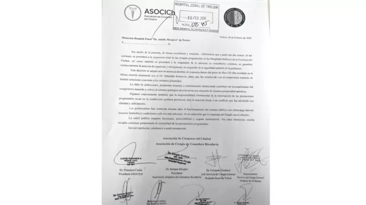 El documento lleva la firma de autoridades de la Asociación de Cirujanos del Chubut y de representantes de los servicios de cirugía general de hospitales públicos de distintas ciudades de la provincia, formalizando así una medida que impacta de manera directa en la programación quirúrgica del sistema sanitario provincial.