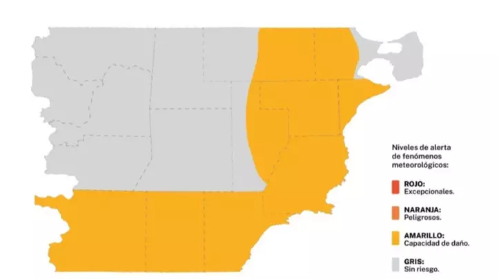 Según el reporte del Servicio Meteorológico Nacional, las zonas afectadas serán alcanzadas por vientos del oeste rotando al sudoeste, con velocidades estimadas entre 40 y 65 km/h y ráfagas que podrían superar los 90 km/h.