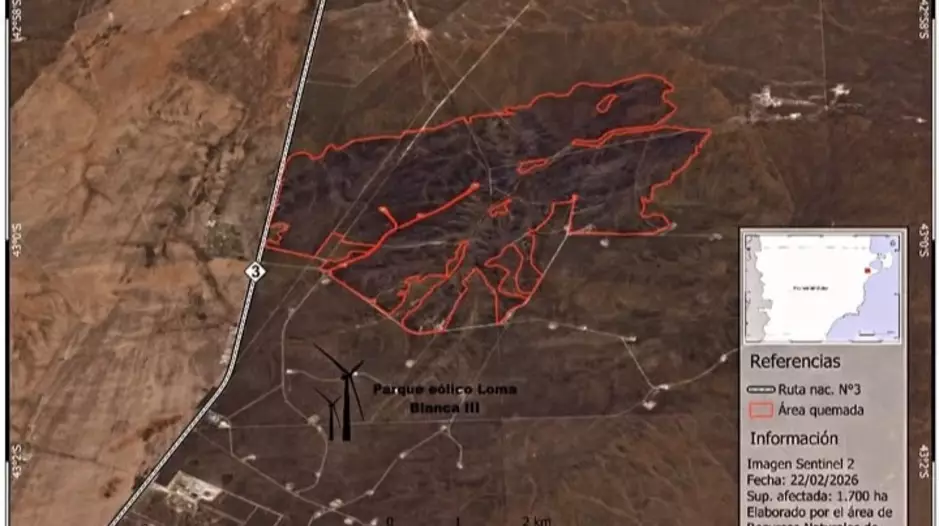 Un incendio rural de gran magnitud se desató los días 21 y 22 de febrero sobre la Ruta Nacional N° 3, en el tramo que une Trelew con Puerto Madryn, y afectó una superficie estimada de 1.700 hectáreas.