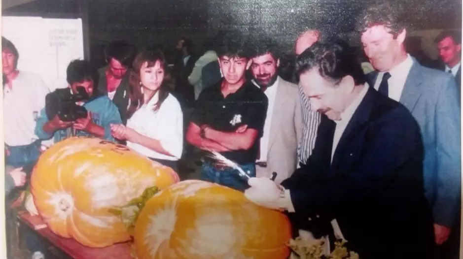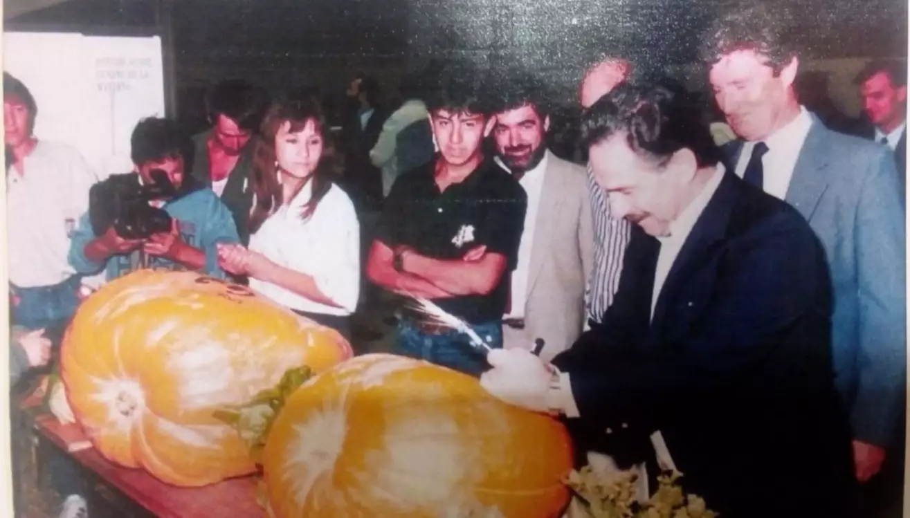 Y en otra imagen del recuerdo, frente a los zapallos gigantes, el gobernador Néstor Perl, don Benito Owen e Isidoro San Pedro, impulsores de la Muestra, a fines de la década del ’80.