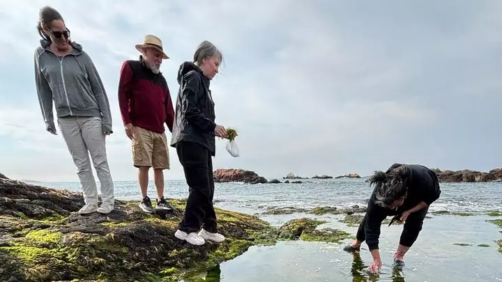 Luego llega el momento de la exploración en el intermareal. Los visitantes caminan entre las rocas para hacer su propia recolección de algas. En el caso de que el ecosistema lo permita y siempre que no haya alertas por marea roja, se levantan mejillones y lapas. La regla de esta cosecha guiada, según detalla la propia cocinera, es aprovechar todo lo que encuentren que se pueda consumir de manera responsable.