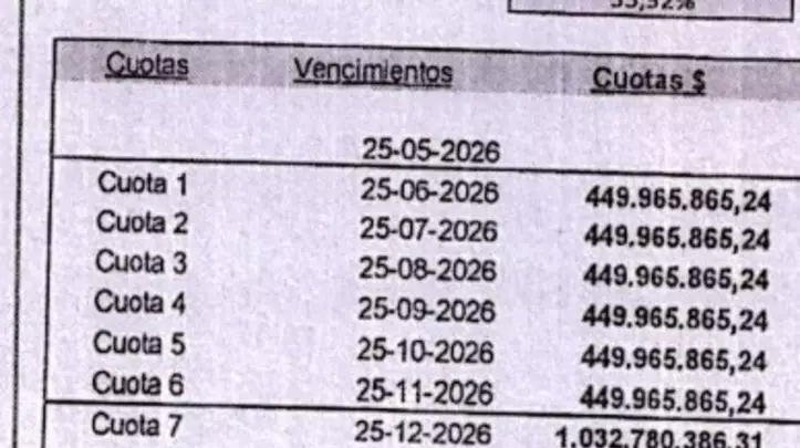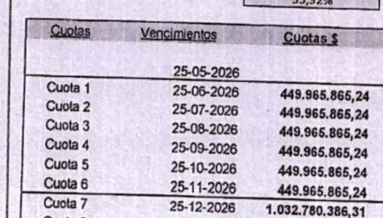 Según los anexos del acuerdo, las primeras seis cuotas, que comenzarán a abonarse a partir de mayo de este 2026, ascienden a $449.985.885,24 cada una. A partir de diciembre, también de este año, el monto mensual se incrementará de manera significativa, alcanzando los $1.032.780.386,31, cifra que se mantendrá hasta completar el total del plan en abril de 2031.