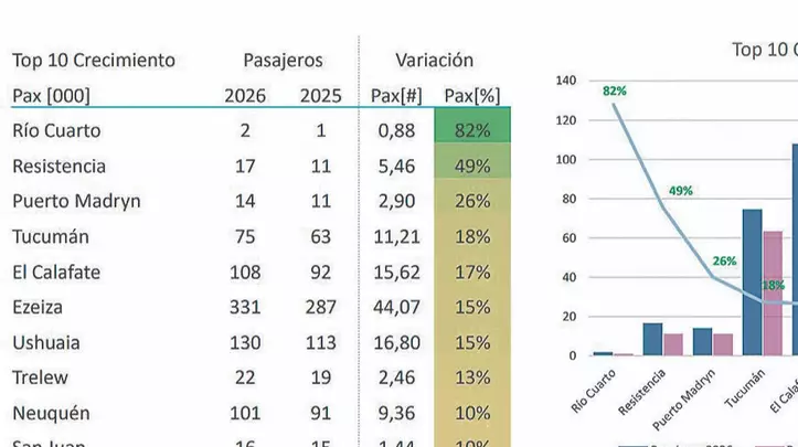 Muy cerca de Trelew, el aeropuerto de Puerto Madryn también mostró cifras muy favorables. Fue la terminal de la provincia que experimentó el mayor salto porcentual, con un crecimiento del 26% en pasajeros de cabotaje respecto al año anterior, alcanzando los 14.000 usuarios frente a los 11.000 de febrero de 2025. Al igual que Trelew, Puerto Madryn integró el podio de los aeropuertos con mayor aumento de demanda a nivel nacional.