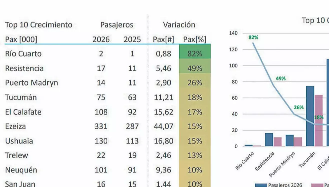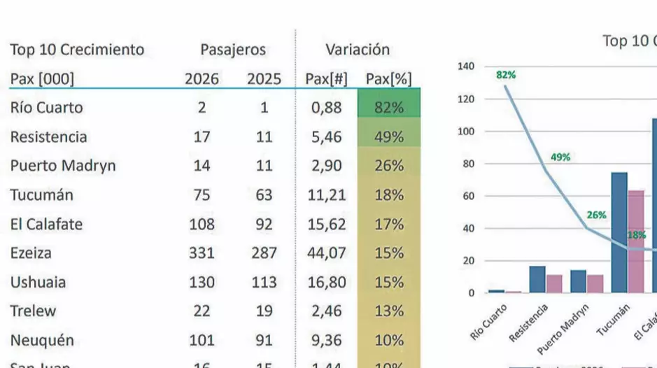 El Aeropuerto Almirante Marcos A. Zar de Trelew se posicionó como uno de los protagonistas del mes a nivel nacional. La terminal registró un total de 22.000 pasajeros de cabotaje, lo que representa un incremento del 13% respecto a febrero de 2025, cuando había movilizado a 19.000 personas. Este desempeño le permitió ingresar en el Top 10 de aeropuertos con mayor crecimiento de pasajeros en todo el país durante el periodo.