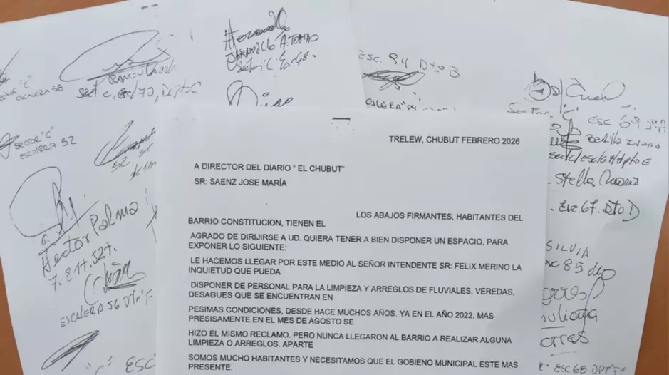 En una nota firmada por unos 50 vecinos del Barrio Constitución, sector de Trelew conocido como Las Mil Viviendas, dirigida al director de nuestro diario, hacen llegar su inquietud al intendente de la ciudad, a los efectos de ponerlo en conocimiento sobre la necesidad de disponer de personal para limpieza y arreglo de pluviales, veredas y otros.