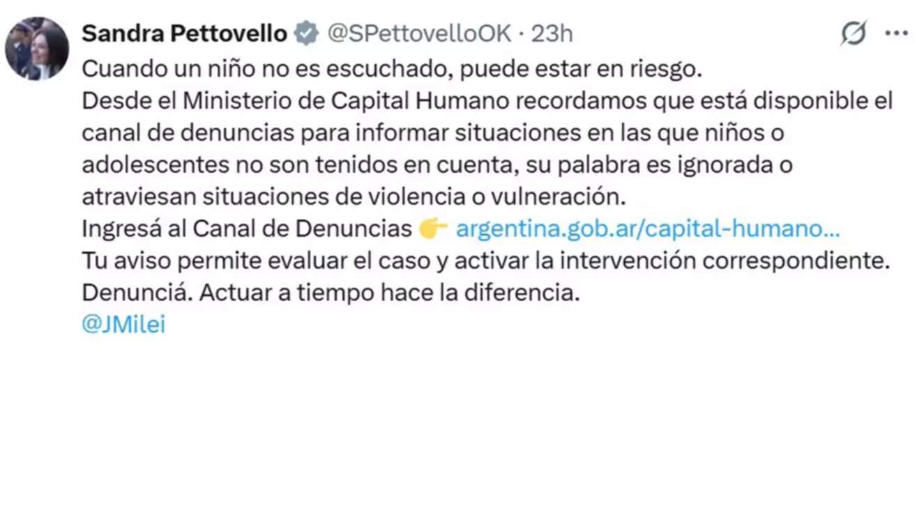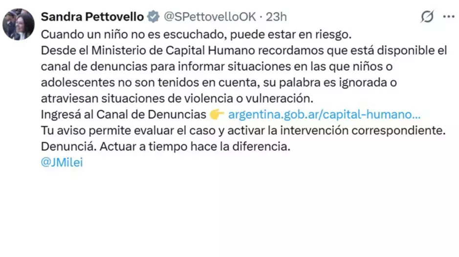 En medio de la conmoción por la muerte de Angel López en Comodoro Rivadavia, la ministra de Capital Humano de la Nación, Sandra Pettovello, publicó durante la noche del viernes un mensaje en su cuenta oficial de X en el que recordó la existencia de un canal para denunciar situaciones de riesgo que afecten a niños y adolescentes.