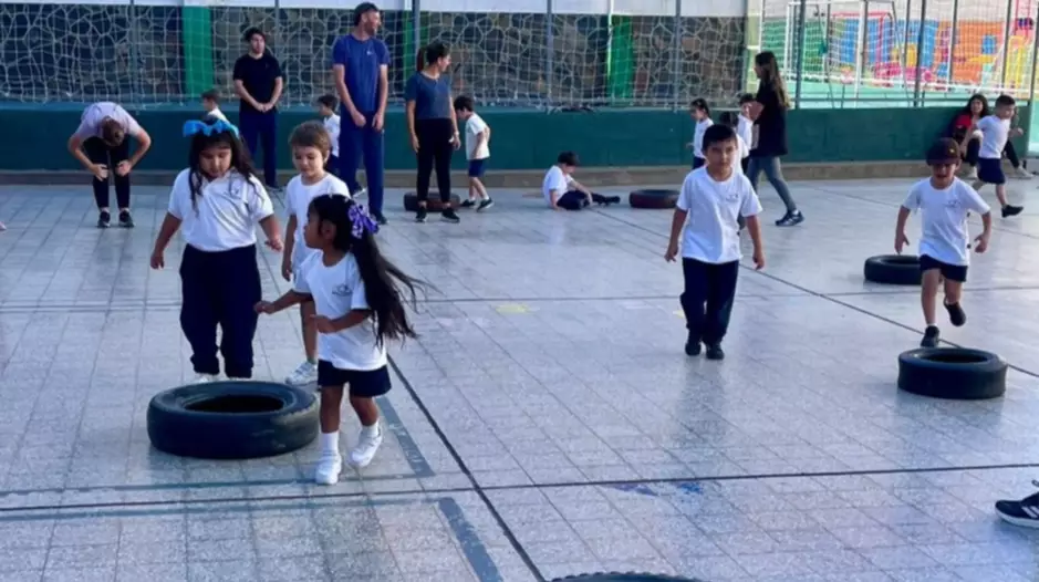 En el patio del colegio se realizó una actividad especial, donde participaron los alumnos de las salas Roja y Azul, junto a los profesores Ignacio González y Facundo Montoya. Disfrutaron de postas de juegos, donde el objetivo fue promover la importancia de mantenerse en movimiento y realizar actividad física diariamente.