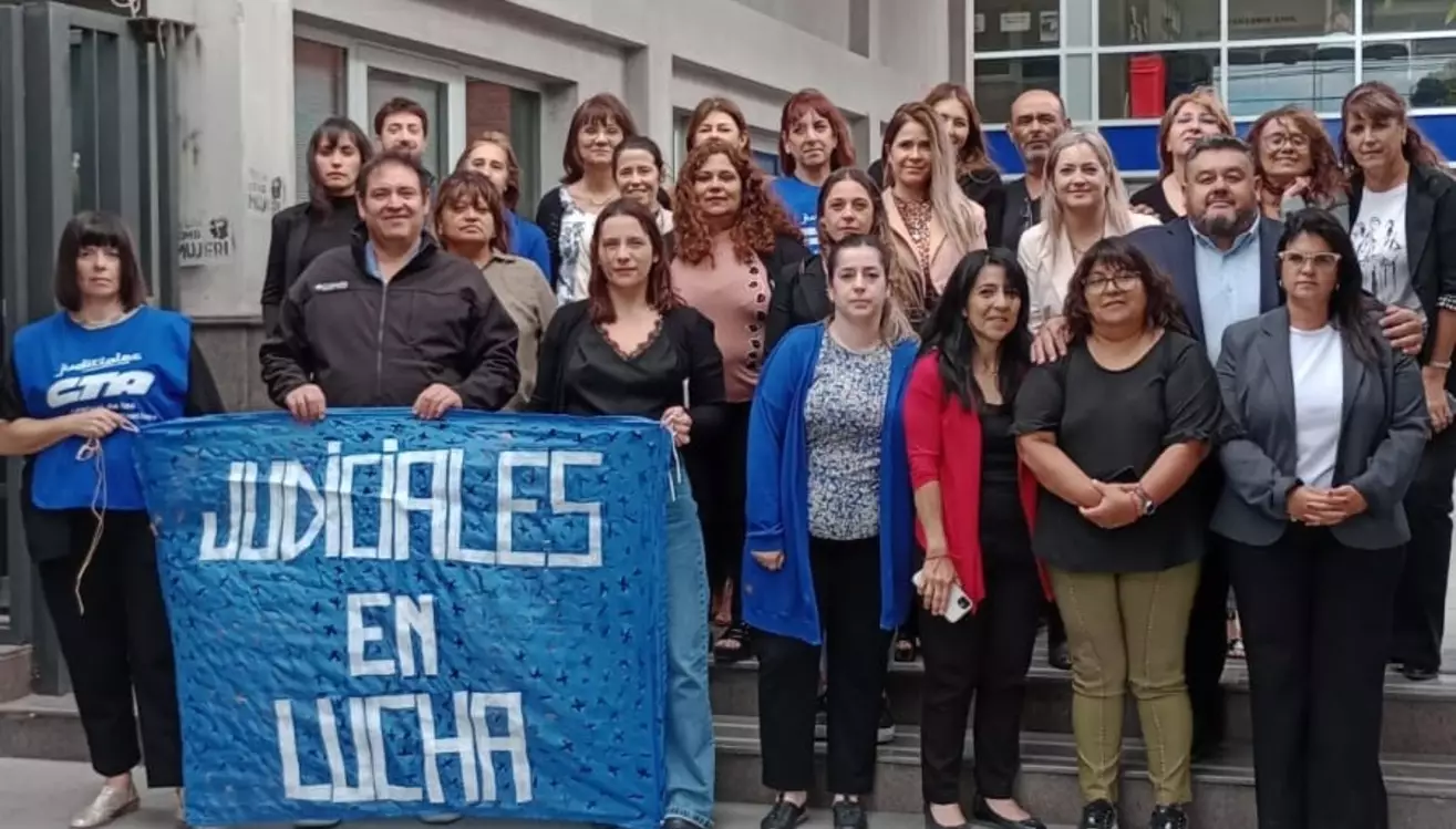 En la mañana de ayer, afiliados del Sindicato de Trabajadores Judiciales del Chubut (Sitrajuch) que se desempeñan en los tribunales de Trelew, visibilizaron su apoyo en la escalinata del edificio de la calle 9 de Julio, en apoyo a los jubilados de Esquel, que vienen reclamando al Gobierno de la provincia el pago en tiempo y forma de sus respectivos haberes, debido a que viene haciéndolo fuera de término, como lo marca la ley.