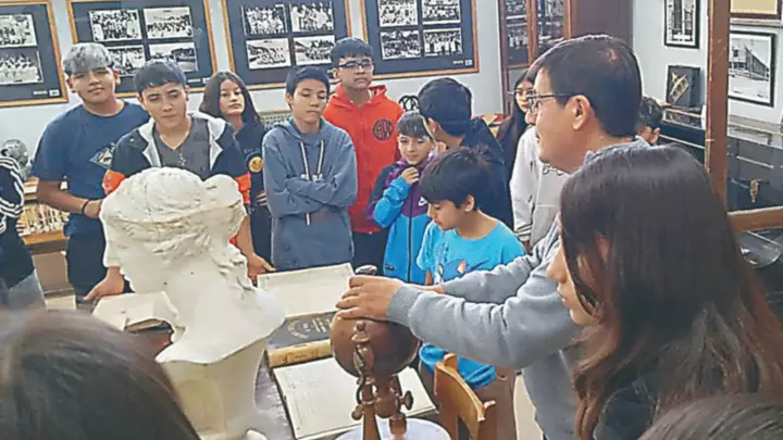 En el marco del 102º Aniversario del Colegio Nacional, el profesor Martín Medina brindó una charla muy amena sobre la historia de la institución, desde sus comienzos y observando cada detalle de los objetos tan preciados para el establecimiento. De la actividad participaron estudiantes del turno tarde acompañados por su profesora, Carina Arzán.