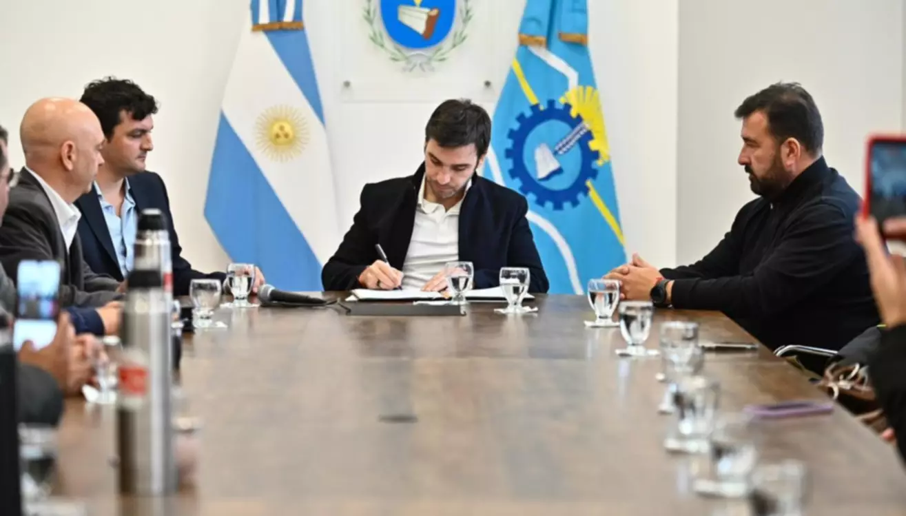 El acto se desarrolló este martes por la mañana en la Sala de Situación de la Casa de Gobierno, y participaron junto al mandatario el secretario general de UOCRA, Javier Moya; el presidente de la Asociación Empresaria Hotelera Gastronómica de Trelew y el Valle, Germán Scandroglio; y el secretario de Trabajo provincial, Nicolás Zárate.