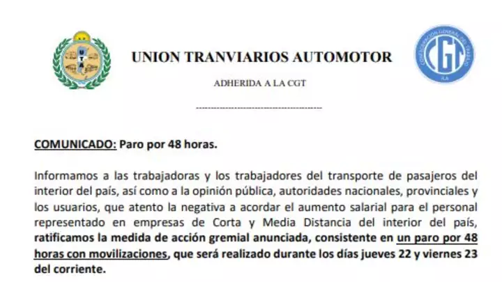 La UTA reafirmó el paro de colectivos de corta y media distancia para este jueves y viernes. Asimismo, desde la Unión Tranviarios Automores (UTA) confirmaron que asistirán este jueves a la audiencia convocada por el Ministerio de Trabajo de la Nación, desde las 15:30 horas.