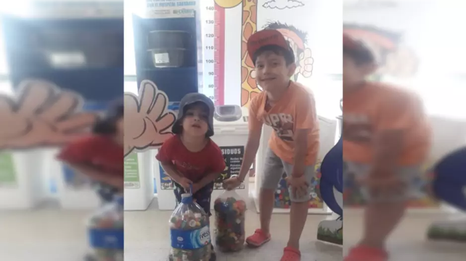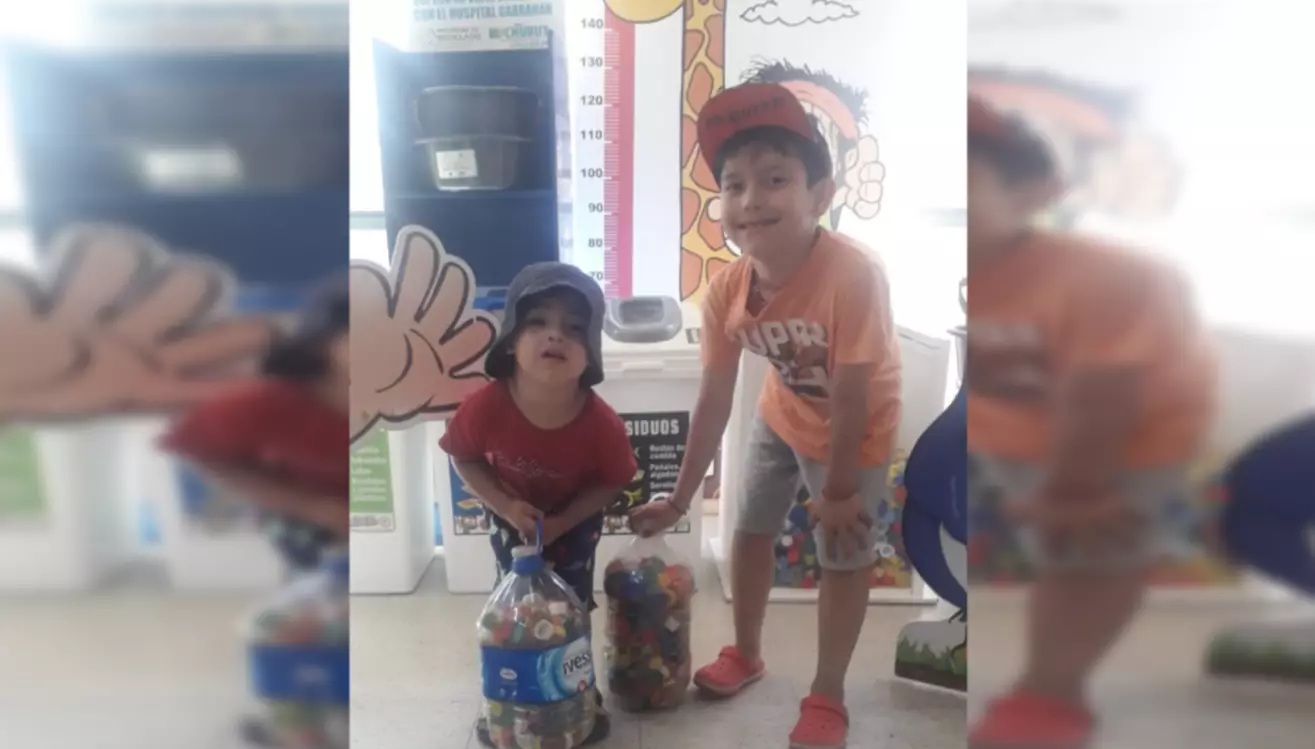 Los pequeños Bastian y Amaru se acercaron este viernes a la redacción de EL CHUBUT para colaborar con sus tapitas con el Hospital Garrahan.