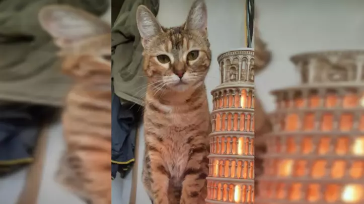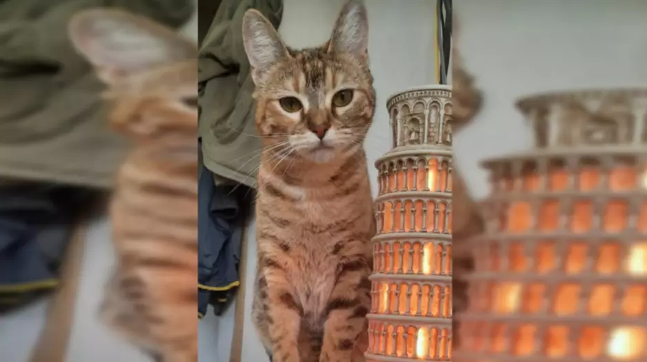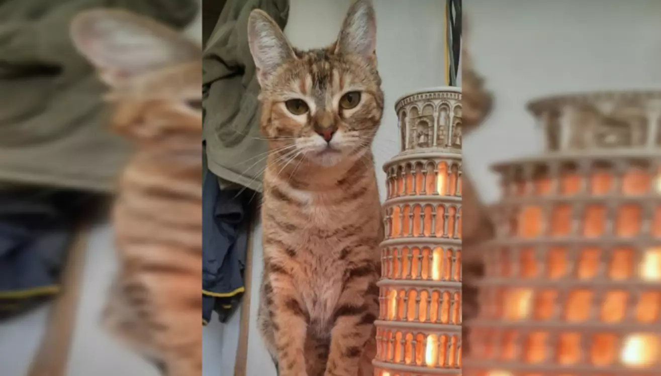 Se trata de una pequeña gatita de un año, anaranjada y con un collar violeta.