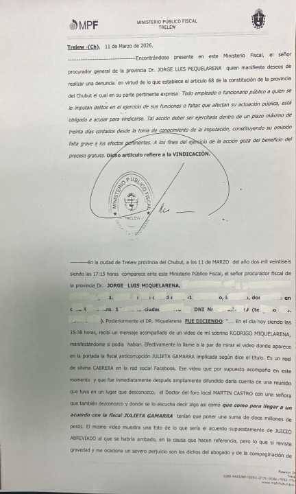 Miquelarena se presentó en la Fiscalía de Trelew y pidió que se abra una investigación por un video difundido en redes sociales