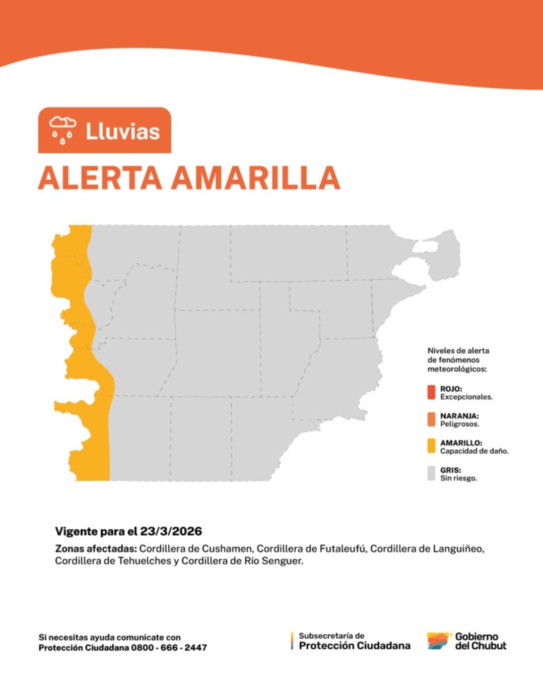 La Subsecretaría de Protección Ciudadana del Chubut informó la vigencia de una alerta amarilla por vientos y otra por lluvias para este lunes 23 de marzo en distintas regiones de la provincia.