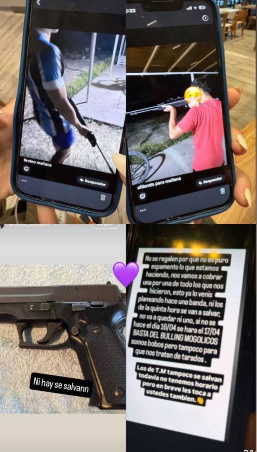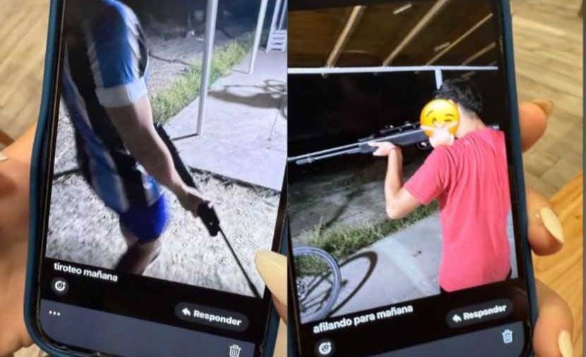Según informó FM Tu Lugar, imágenes con contenido amenazante habrían llegado a alumnos de la Escuela 714. En ellas se observa lo que serían menores no identificados exhibiendo armas de fuego, acompañadas de mensajes como “tiroteo mañana” y “afilando para mañana”.