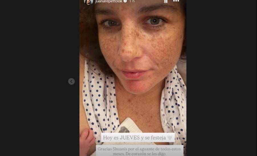 Juana, hija de Nicolás Repetto y Reina Reech, había estado compartiendo historias en Instagram de su gatito bebé y de sus dos hijos compartiendo la llegada del animalito. Luego, casi de manea inesperada llega la imagen con su tercer hijo en brazos y la bata de hospital.