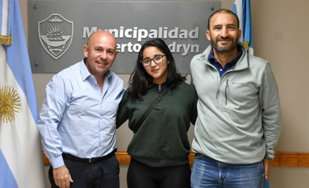 El intendente Gustavo Sastre recibió esta mañana, junto a Andrés Calabró, subsecretario de Deportes de la ciudad, a Eluney Huenupi, atleta madrynense que recientemente se consagró campeona nacional de escalada.
