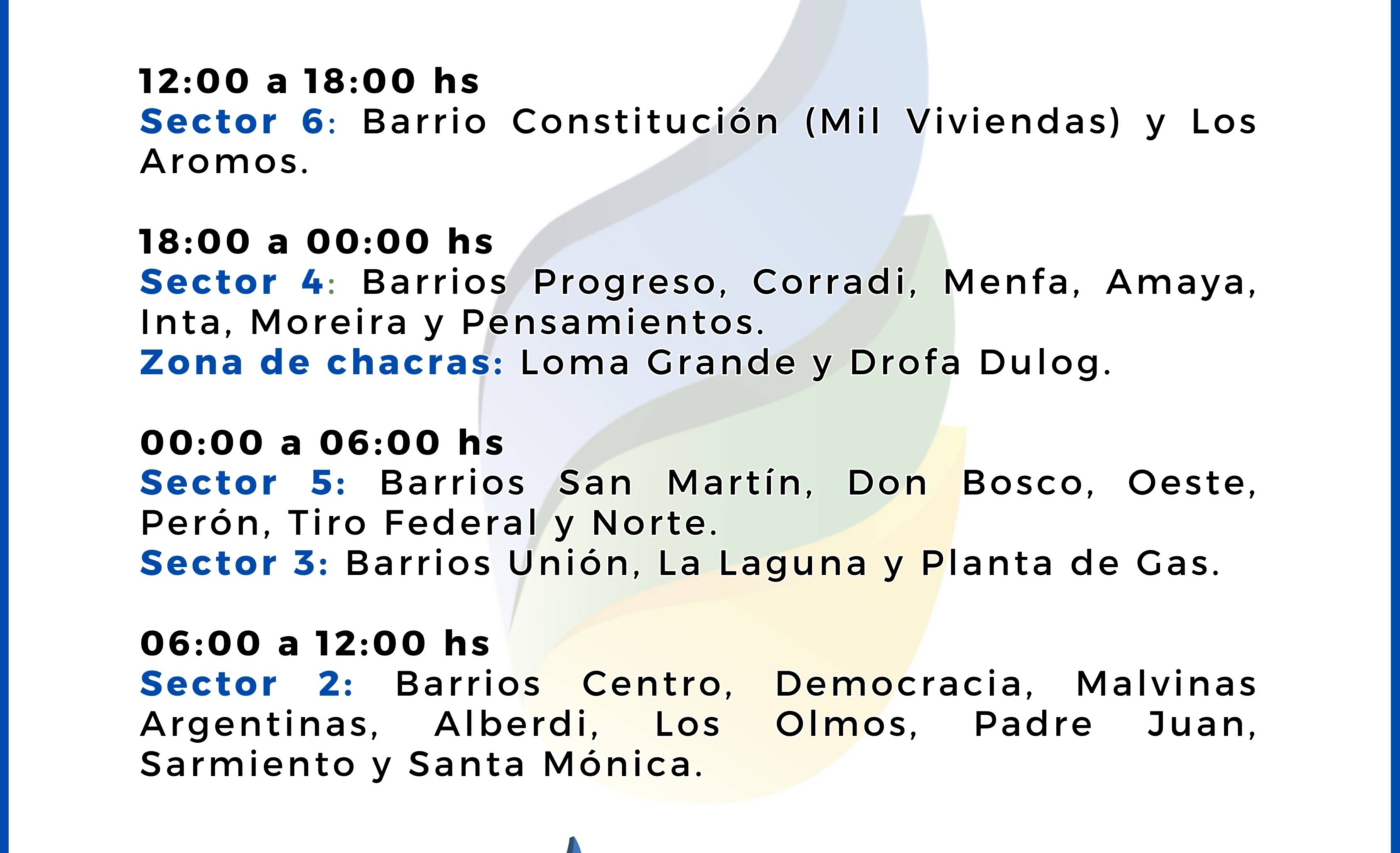 La Cooperativa Eléctrica de Trelew informa a la comunidad que se llevará a cabo la habilitación de la red de agua potable de manera sectorizada, de acuerdo con el siguiente cronograma: