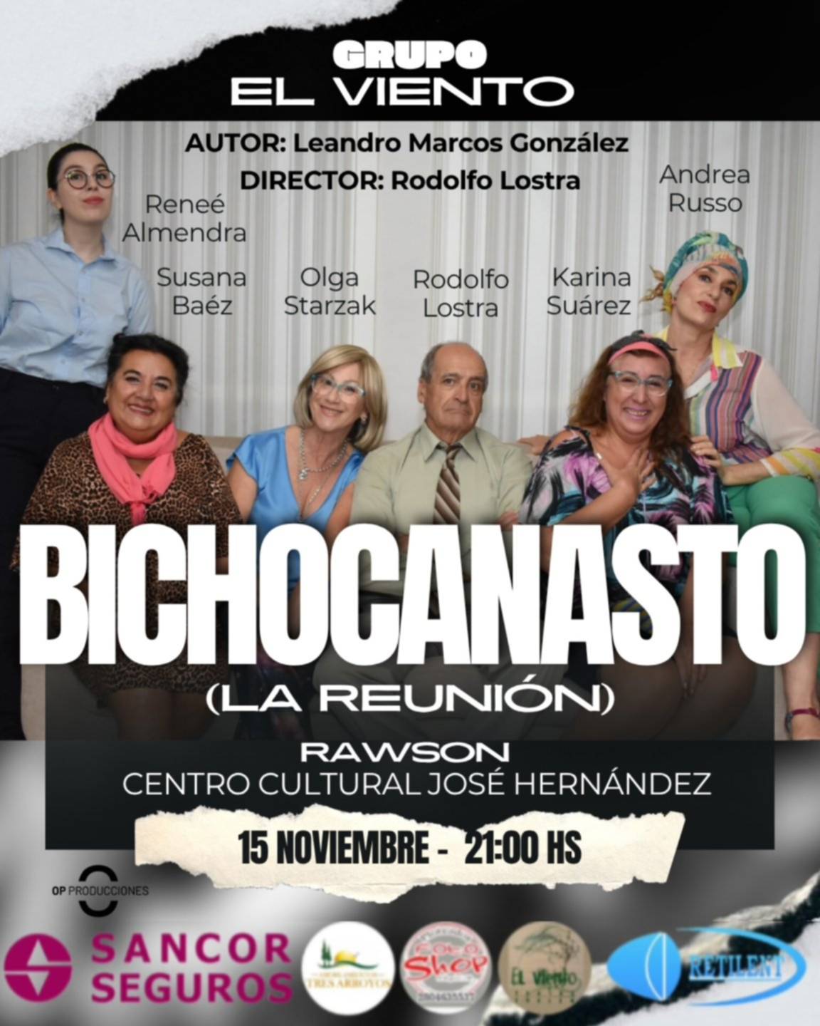 Luego de cuatro exitosas funciones en el Teatro Español de Trelew, el grupo teatral El Viento ofrecerá una función de la comedia “Bichocanasto” (La reunión) del dramaturgo Leandro Marcos González el sábado 15 de noviembre a las 21 horas en el Centro Cultural José Hernández de Rawson.