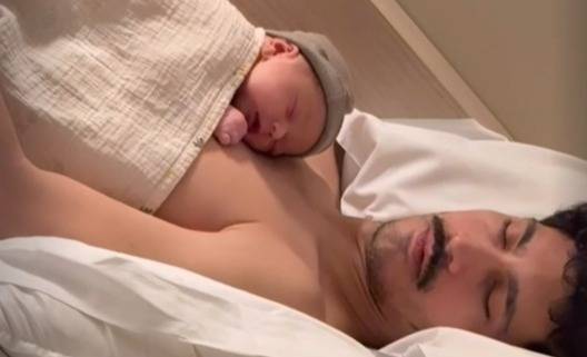 Ahora fue la mamá la que decidió mostrar la carita del recién nacido junto a su papá con la leyenda "Hola Papá". Utilizó sus historias de Instagram para mostrarlos y lo hizo con dos fotos, una donde se los ve recostados en un sillón muy cómodo y una segunda donde ya están durmiendo.
