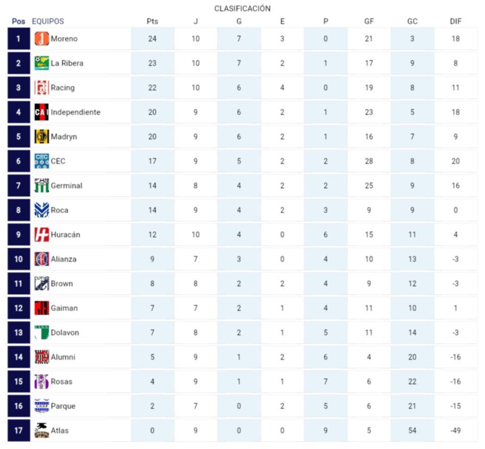 En tanto en Puerto Madryn, con no poco esfuerzo, Defensores de La Ribera regresó a la ciudad capital con los tres puntos al ganar agónicamente por 2 a 1 y ello le permite ser el único escolta de J.J. Moreno (24) sumando 23, dejando a Racing Club transitoriamente en el tercer lugar con 20 unidades.