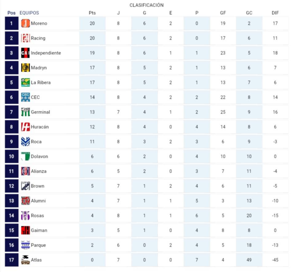 Con estos resultados, Independiente quedó a un punto de los líderes (Moreno y Racing), con los mismos partidos, mientras que Madryn igualó la línea de La Ribera, a tres de distancia de la punta.