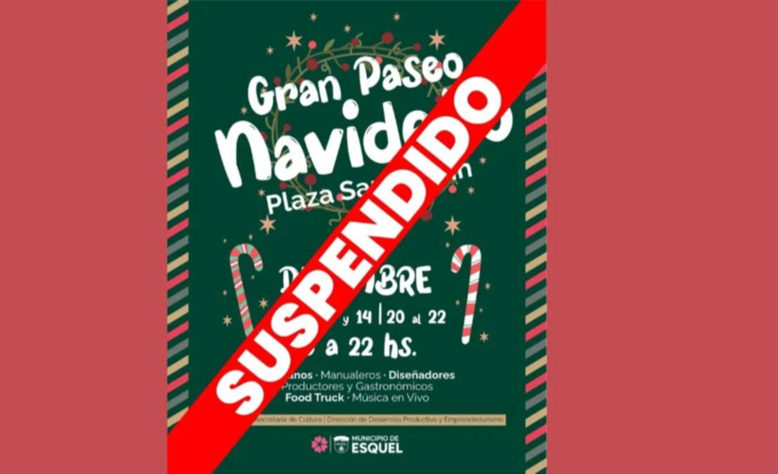 La Municipalidad de Esquel informa que el Paseo Navideño previsto para este fin de semana, 13 y 14 de diciembre, en Plaza San Martín, queda suspendido debido a la alerta amarilla por vientos y probabilidad de lluvias emitida por el Servicio Meteorológico Nacional.