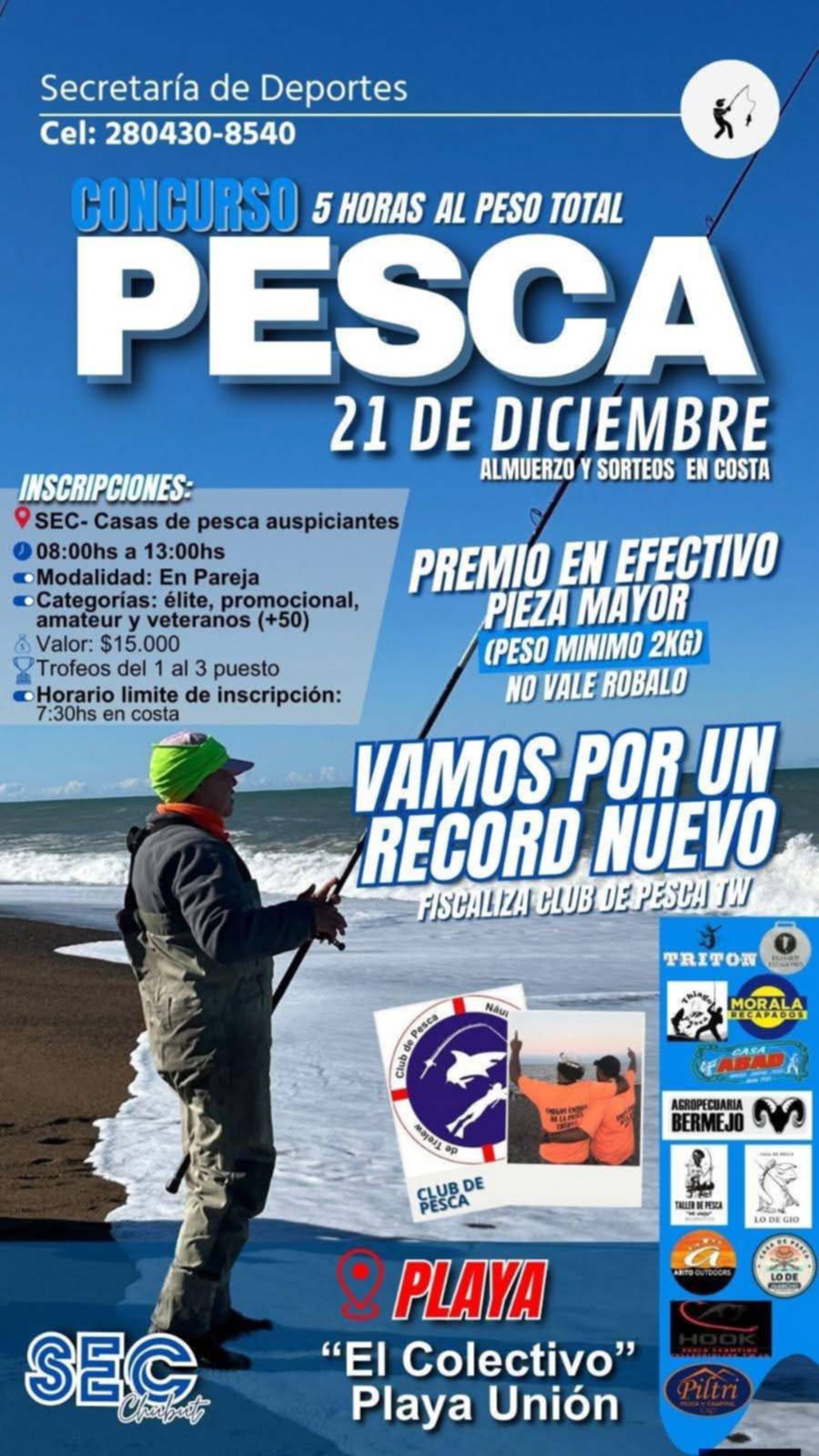 Las inscripciones que tienen un valor de 15.000 pesos por pareja -modalidad en que se pescará- se reciben en la playa desde las 7.30 hs.