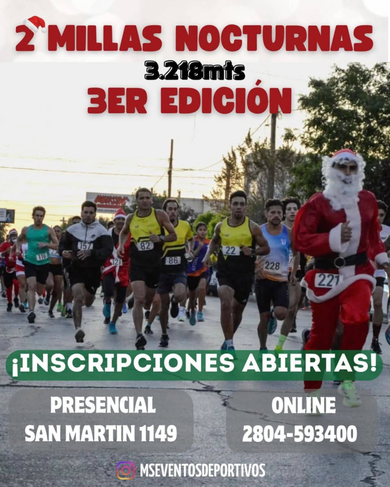 Este sábado, desde las 21:30 horas, con punto de largada en la Pista Municipal de Trelew, se correrá la tercera edición de las "Dos Millas Nocturnas de Navidad", que organiza MS Eventos Deportivos.