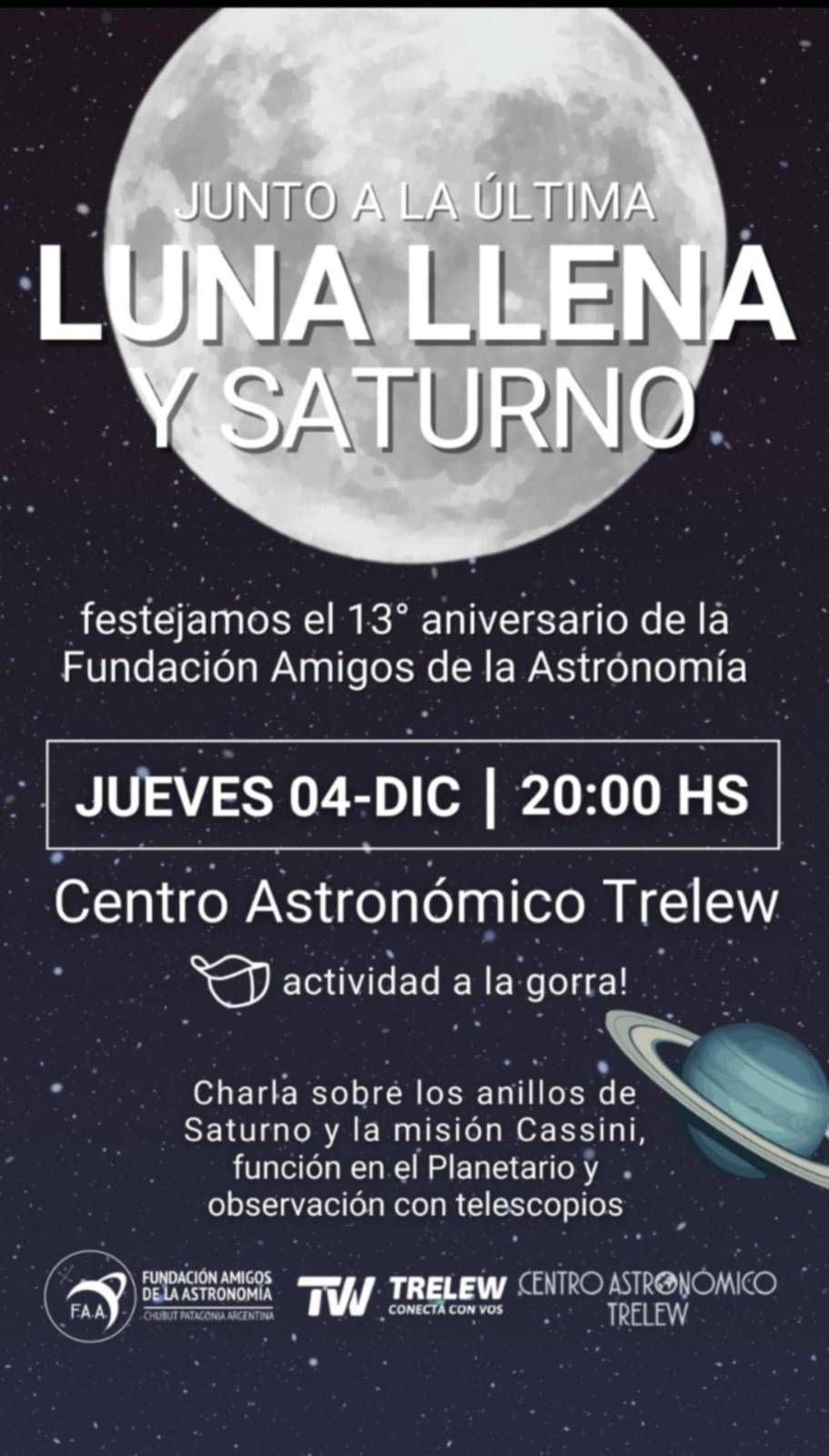 La Fundación Amigos de la Astronomía celebrará este jueves 4 de diciembre, desde las 20 horas, su 13º aniversario con una propuesta abierta para toda la comunidad en el Centro Astronómico de Trelew, aprovechando además la última luna llena del año. La actividad será a la gorra.