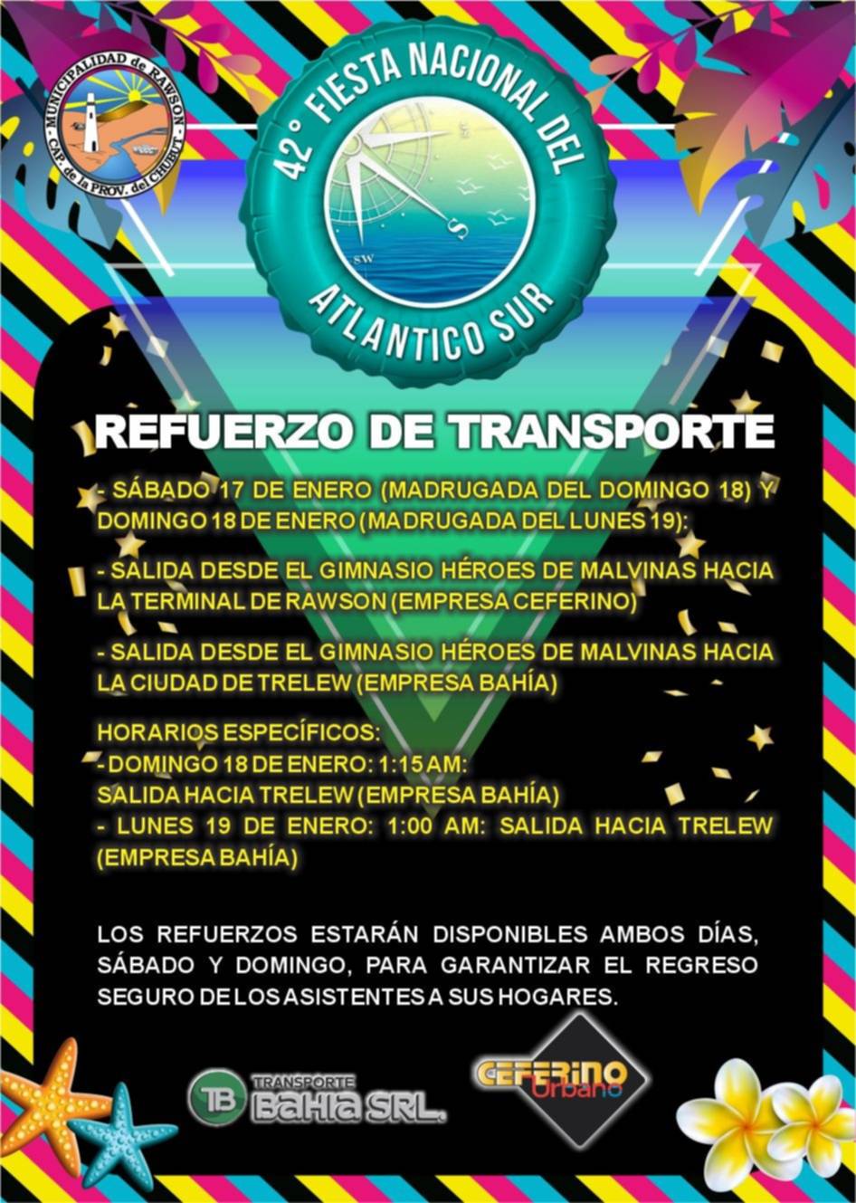 Con motivo de la 42ª Fiesta Nacional del Atlántico Sur, la Municipalidad de Rawson dispuso un refuerzo de transporte público para garantizar el regreso seguro de los asistentes, con servicios especiales hacia Rawson y Trelew durante la madrugada.