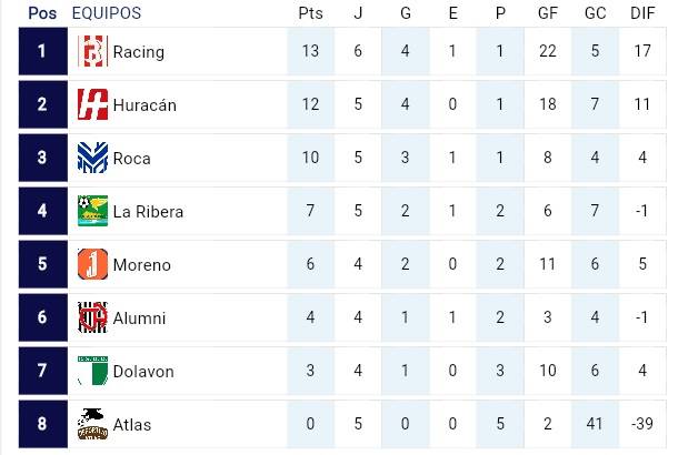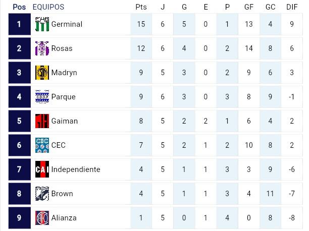 De esta forma, la Zona 1 tiene como único puntero a Germinal, con 15 puntos; su escolta es Juan Manuel de Rosas, con 12 unidades; mientras que en la Zona 2, Racing trepó a los más alto con 13 puntos; le siguen con un partido menos Huracán (12) y Roca (10).