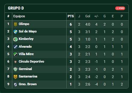 Al final fue derrota para Guillermo Brown, que permanece en el último puesto, con solo una unidad en tres presentaciones; por su parte, Olimpo logró su segunda victoria, en igual cantidad de partidos, y se ubica en la cima, con 6 puntos, uno más que Sol de Mayo y Kimberley.
