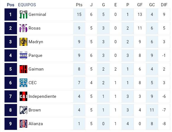 Con este resultado, Germinal alcanzó los 15 puntos y estiró su ventaja en la cima de la Zona 1; como escoltas quedaron Juan Manuel de Rosas, Deportivo Madryn y Defensores del Parque, con 9 unidades, los dos primeros con un partido menos.