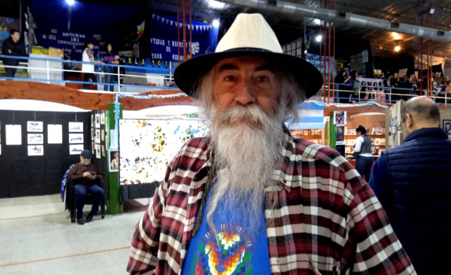 Roberto Moscoloni es poeta, escritor y narrador oral oriundo de la ciudad de La Plata, luego vivió muchos años en la provincia de Río Negro. Y quienes recorren la Feria del libro de Gaiman se lo van a cruzar. De barba canosa, profusa, camisa escocesa, remera de pueblos originarios y sobrero multicolor, es un personaje más que interesante para poder interactuar, pero no por su apariencia, sino por lo que nos tiene para contar.