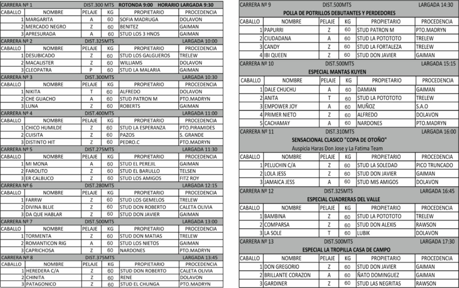 Otra de las competencias tendrá como a los baguales La Sole (Lubik Dolavon), Bambina (Baffigi Trelew) y Comparsa (Alderete Rawson) que se preparan para el clásico de 325 metros con tres ejemplares.