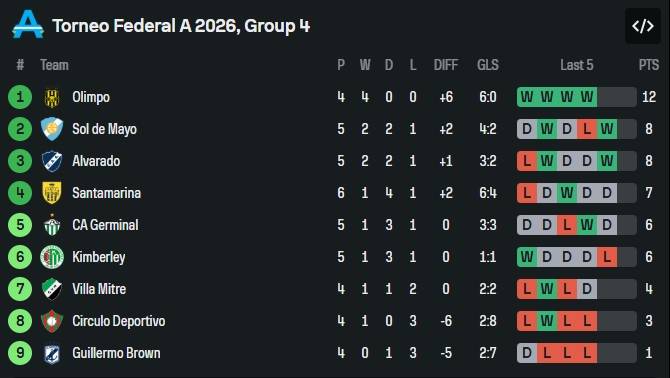 La sexta fecha de la Zona 4 se completará el domingo, con tres partidos: Alvarado recibirá a Villa Mitre, en la ciudad de Mar del Plata, desde las 15:00; Brown hará lo propio con Kimberley, a las 15:30, y el puntero Olimpo será anfitrión de Circulo Deportivo, en el mismo horario.