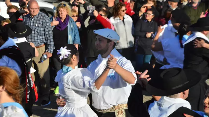 Cerca del final se sumaron también al tradicional baile del pericón comunitario en Ballet Pilmaiquen, que dirige Natalia Centeno, la pareja de Tango Mariana Ocampo y Rubén Irribarren y el Taller de Extensión Universitaria San Juan Bosco, que también dirigen Yamandú Gil Moya y Dana Thomas. En total hubo más de 168 bailarines.