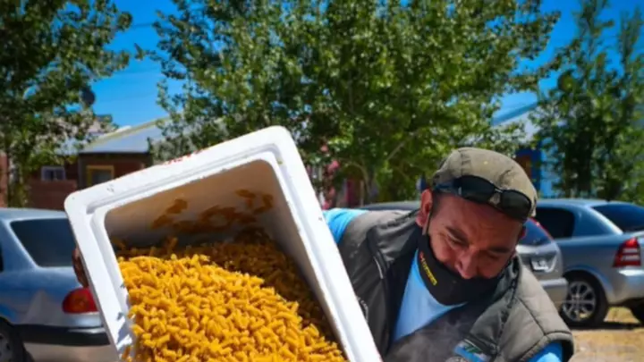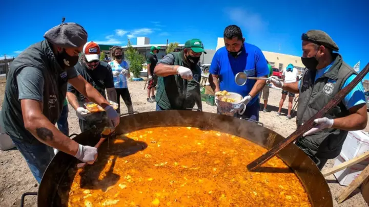 El sindicato de camioneros organizo una comida popular en el barrio Moreira 4 de Trelew, donde prepararon más de 460 porciones de guiso de fideos con pollo, 400 bollitos de pan y 90 docenas de tortas fritas.