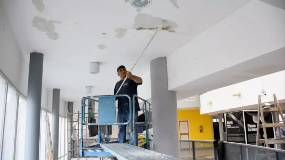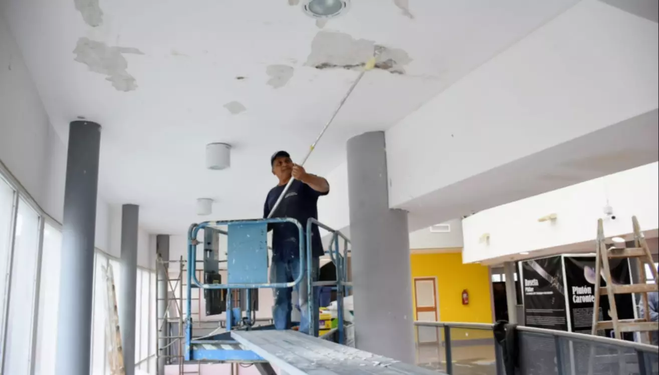 En el interior se concreta la reparación de placas de yeso en varios sectores del techo, arreglos en durlock y pintura general, incluyendo el sector de hall de entrada.