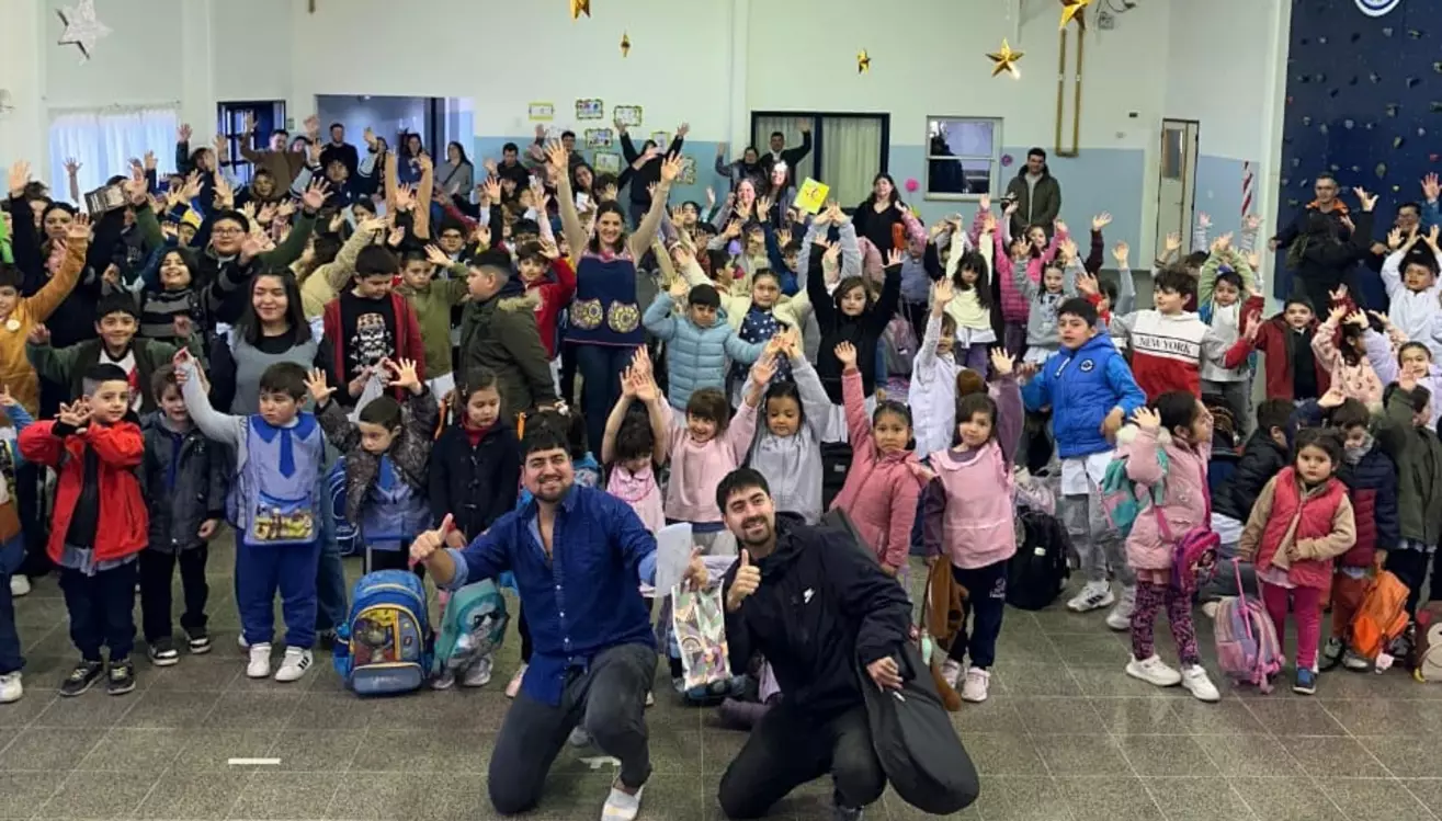 El cantante local visitó la escuela del barrio Los Teros e interpretó, junto a los alumnos, las canciones "Mi Lugar" y "Banderita de Mi Escuela".